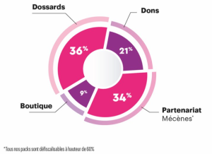 Les recettes de l’association sont issues principalement du mécénat, des dons et des ventes de dossards dans le cadre des événements qu’elle organise, et notamment Courir POUR ELLES en mai, Rouler POUR ELLES en septembre, Bouger POUR ELLES en octobre, et Rando POUR ELLES en novembre.